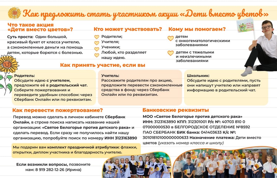 Друзья, мы приготовили для Вас памятку об акции «Дети вместо цветов 2025», чтобы не пропустить возможность сделать добро и помочь Детям. Здесь подробно описано, кого мы поддерживаем, кто может стать участником, как рассказать об акции и куда отправлять пожертвования.